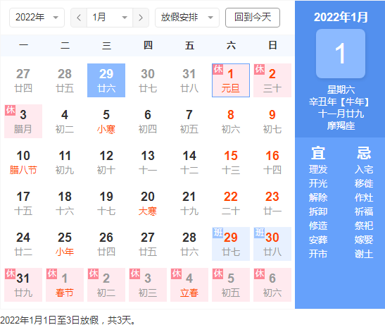 2022年1月1日至1月3日(周六、周日、周一)放假共3天。